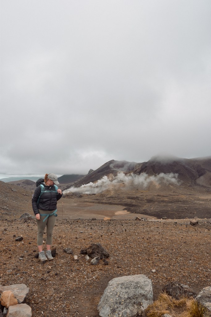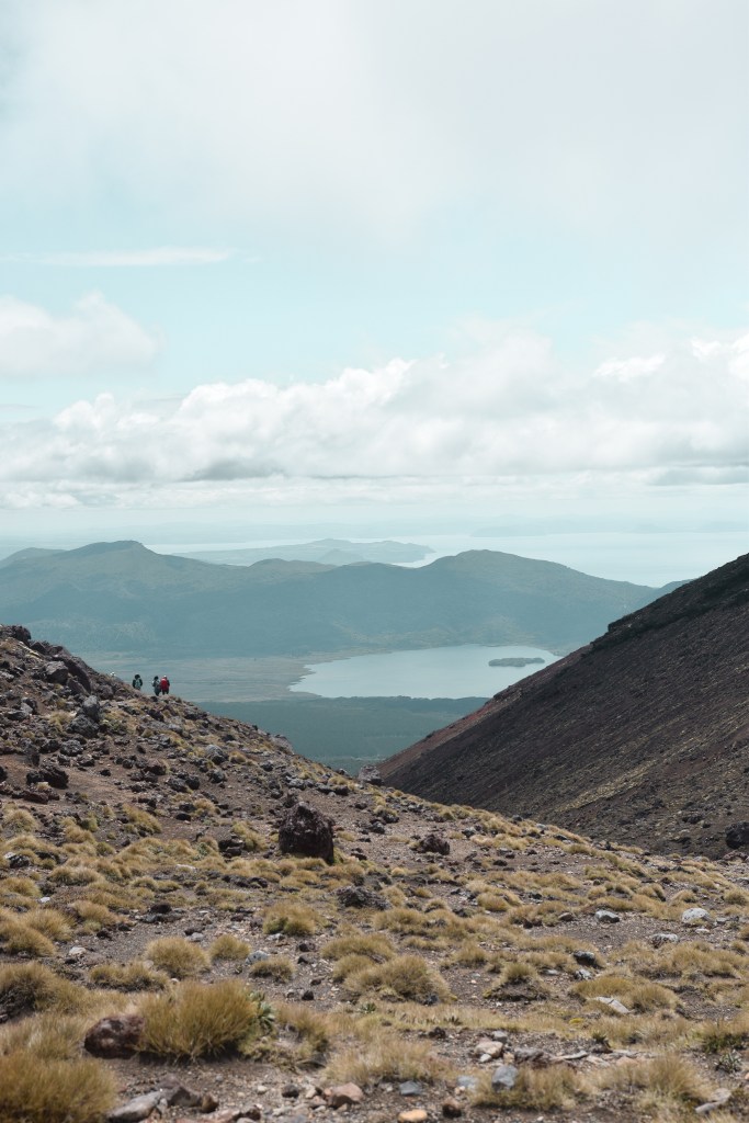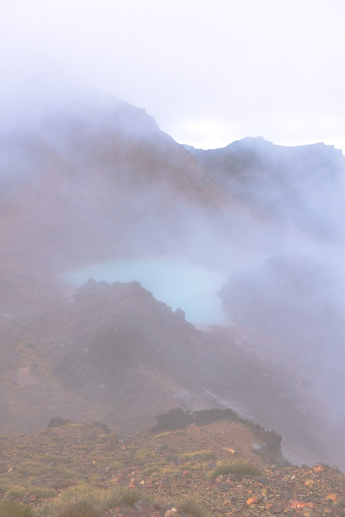 Congratulations! This is half way through the gruelling hike. Just past the red crater you will notice a pile of rocks and a flag signifying the alpine summit. Your aching legs will be distracted by the three pools of blue water from this view point. On a clear day this view is extraordinary, and a large reason as to why people do the hike in the first place. Unfortunately for me it was cloudy, but the trek does encircle the pools, which allows you to view the area at a close range. It is important not to touch these pools of water due to being sacred to the Maori people. Just keep in mind that the ash and soil on the decent of this area is extremely slippery and smells strongly of sulphur, but I promise it’s worth it.
